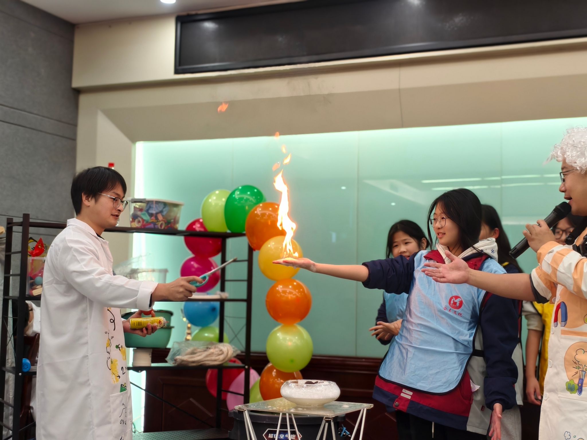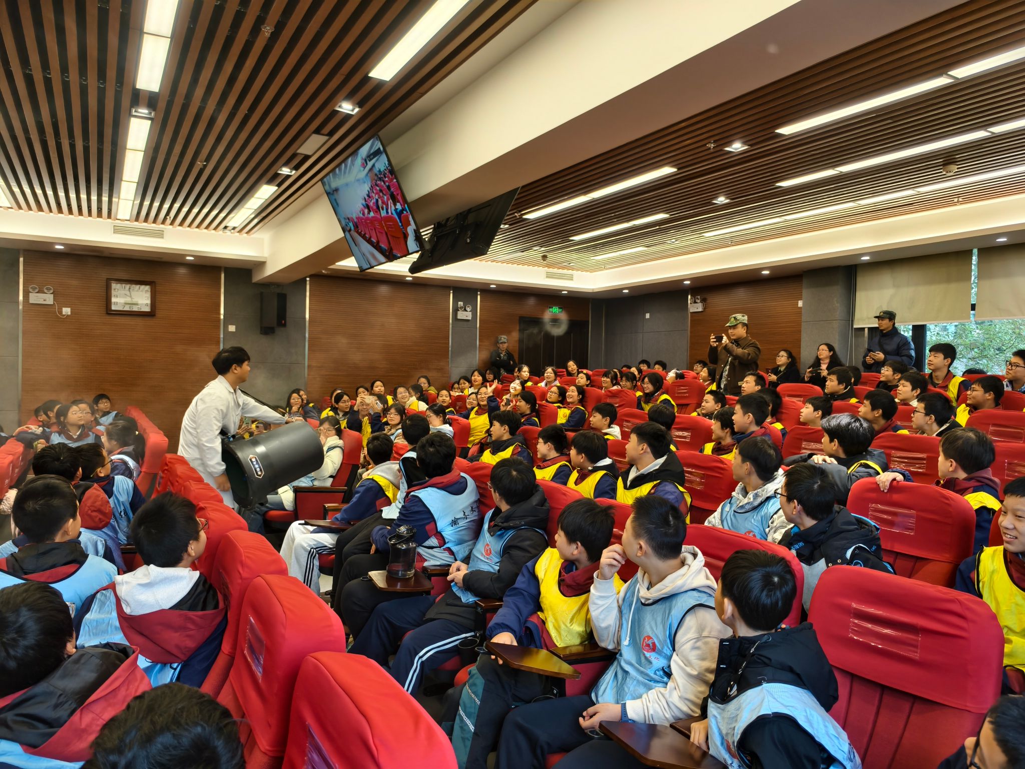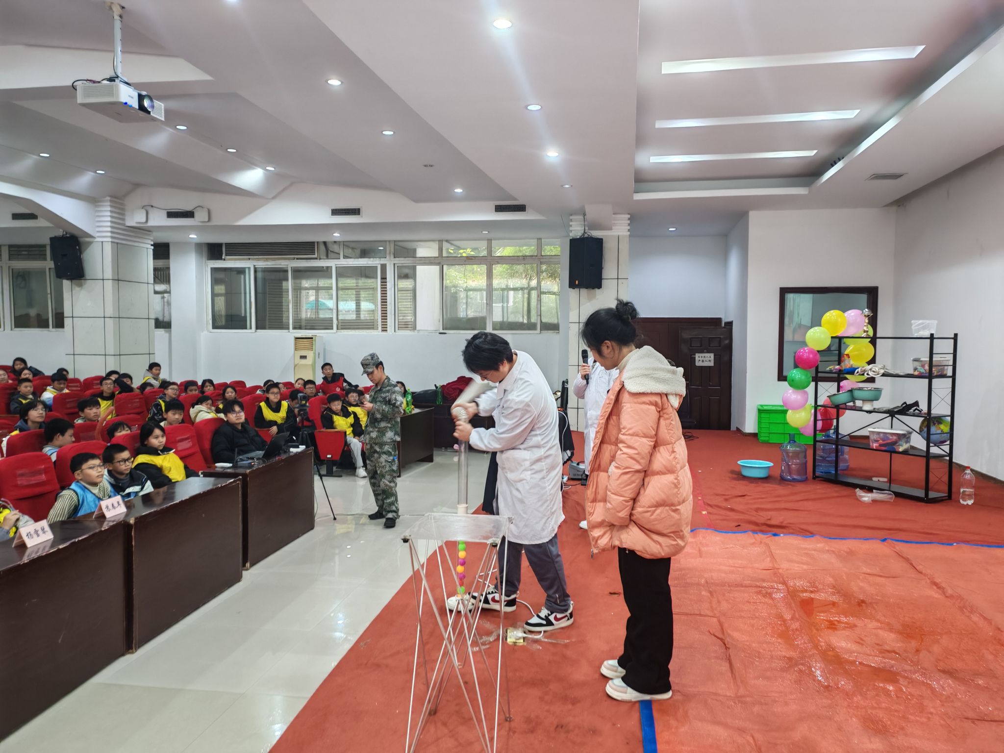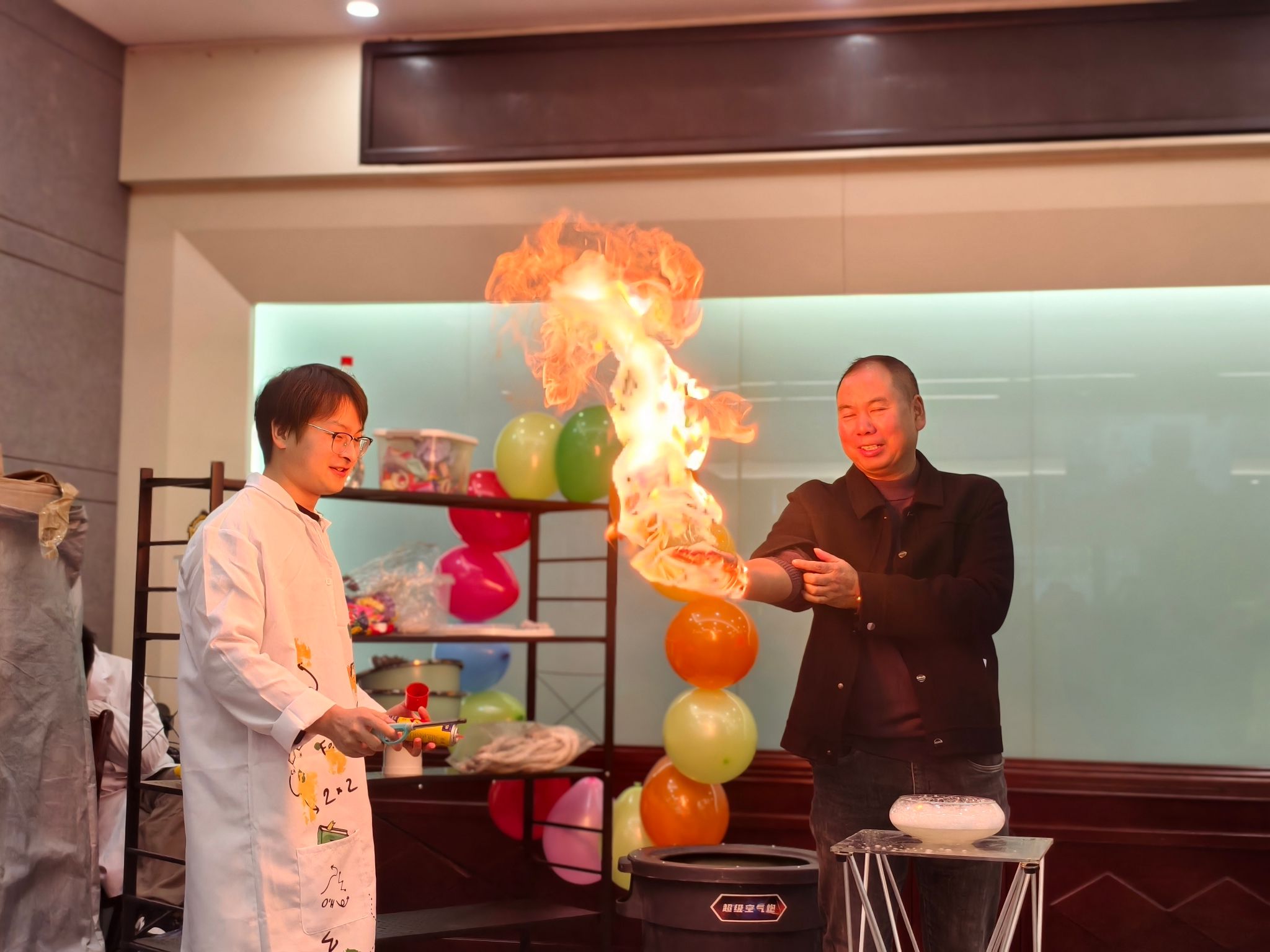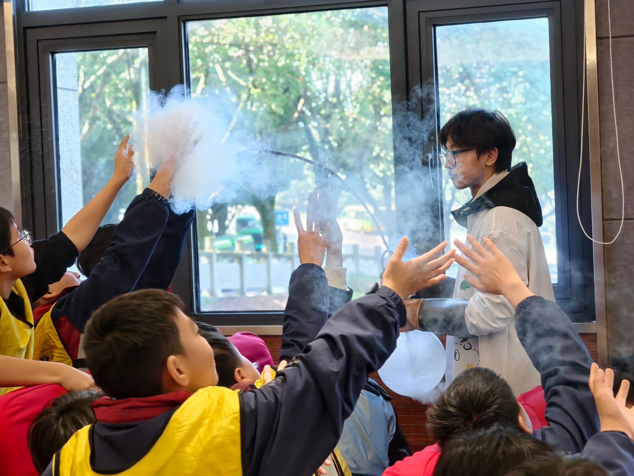 在魏勇老师的带领下,科普团队精心设计了以“体验科学、激发创新”为主题的科普实验展示环节。“空气大炮”“马德堡半球”“干冰泡泡”“液氮大爆炸”等经典科学实验依次呈现,将伯努利原理、大气压力、物态变化等知识转化为可观、可感、可参与的互动体验。现场气氛热烈,同学们在惊叹与掌声中切身感受到科学的魅力,激发了同学们对科学原理的浓厚兴趣。