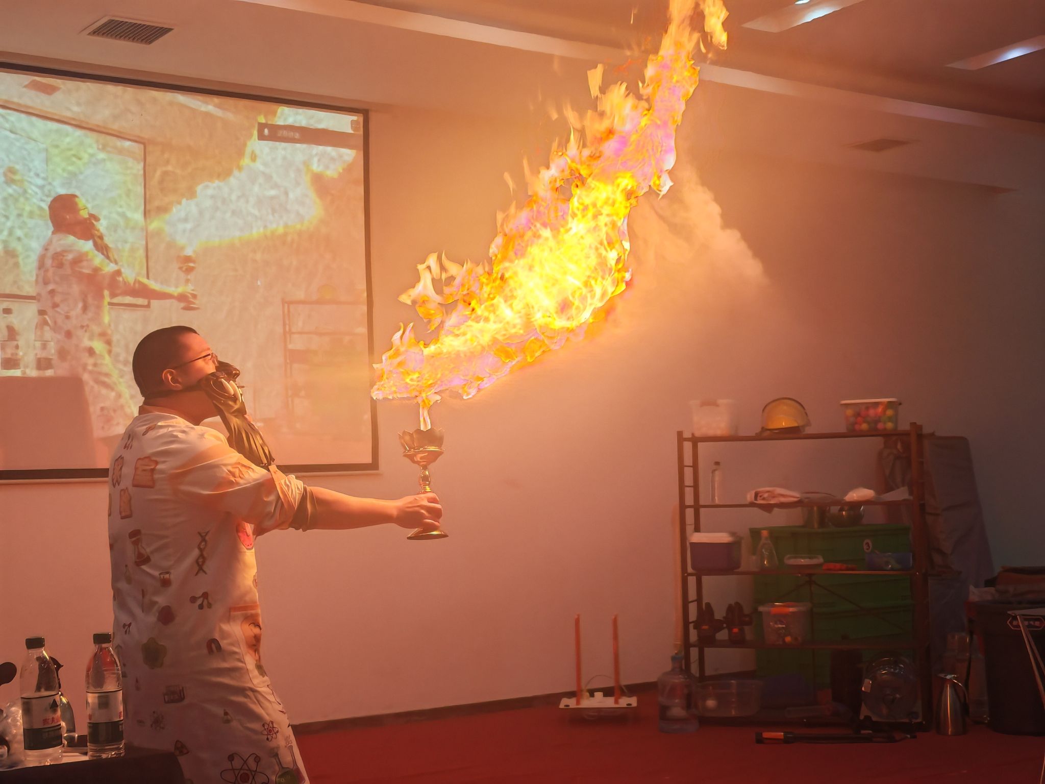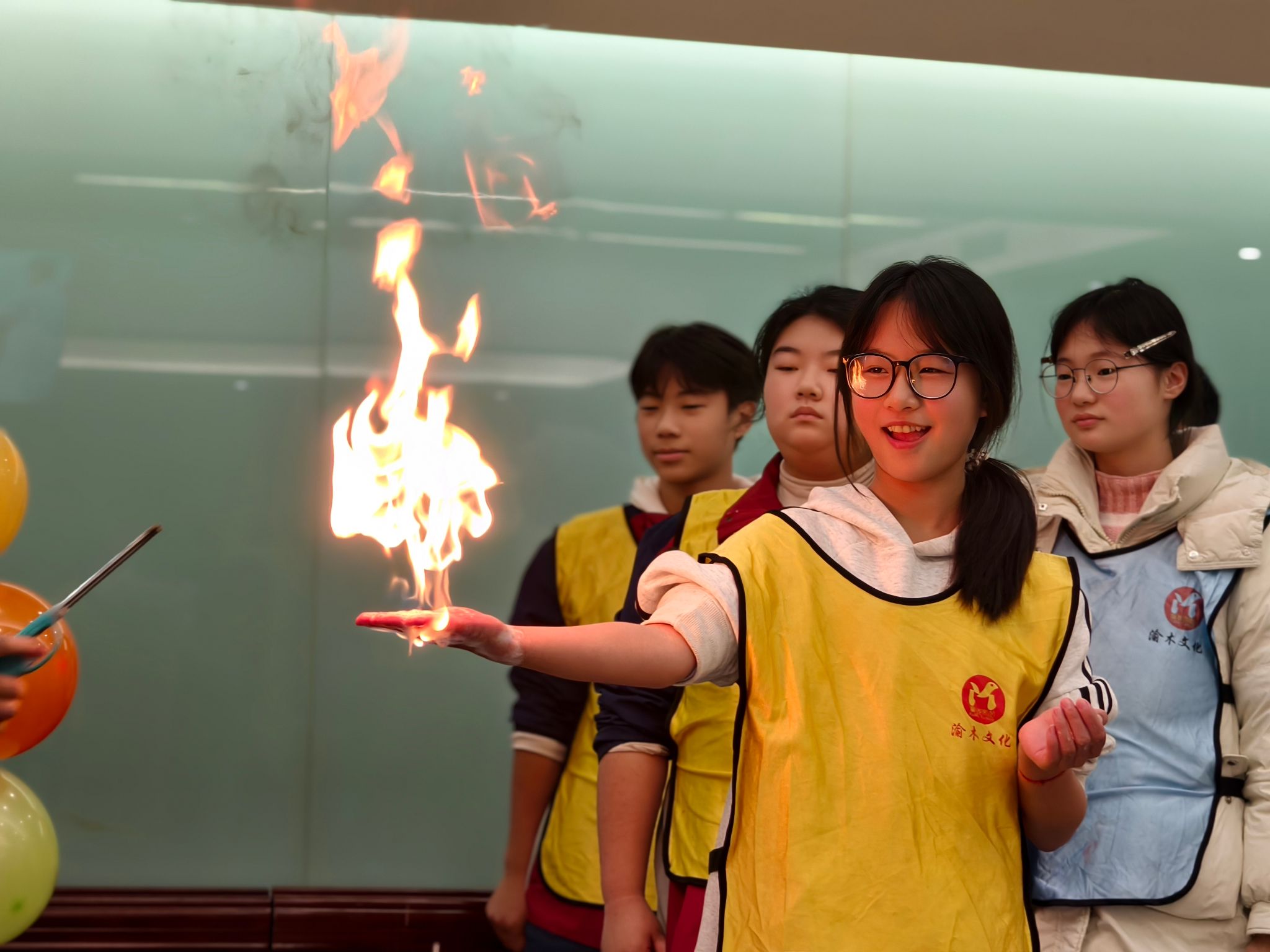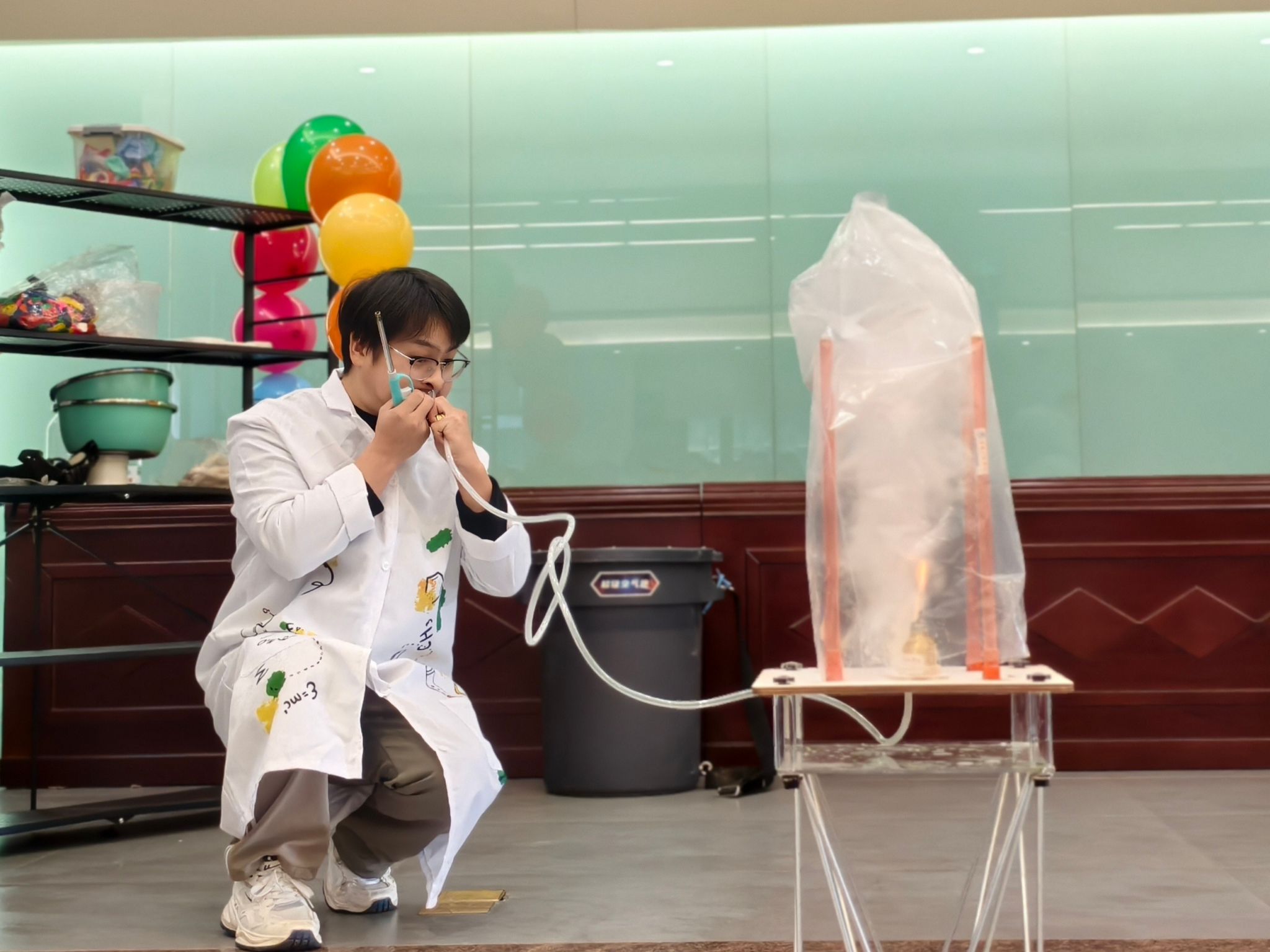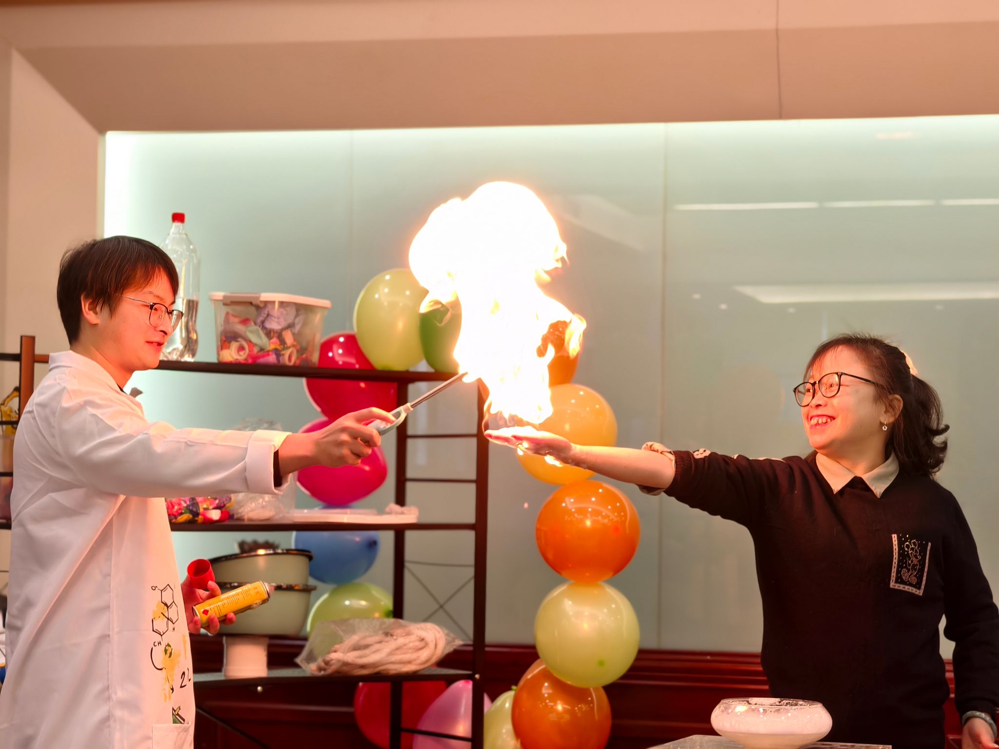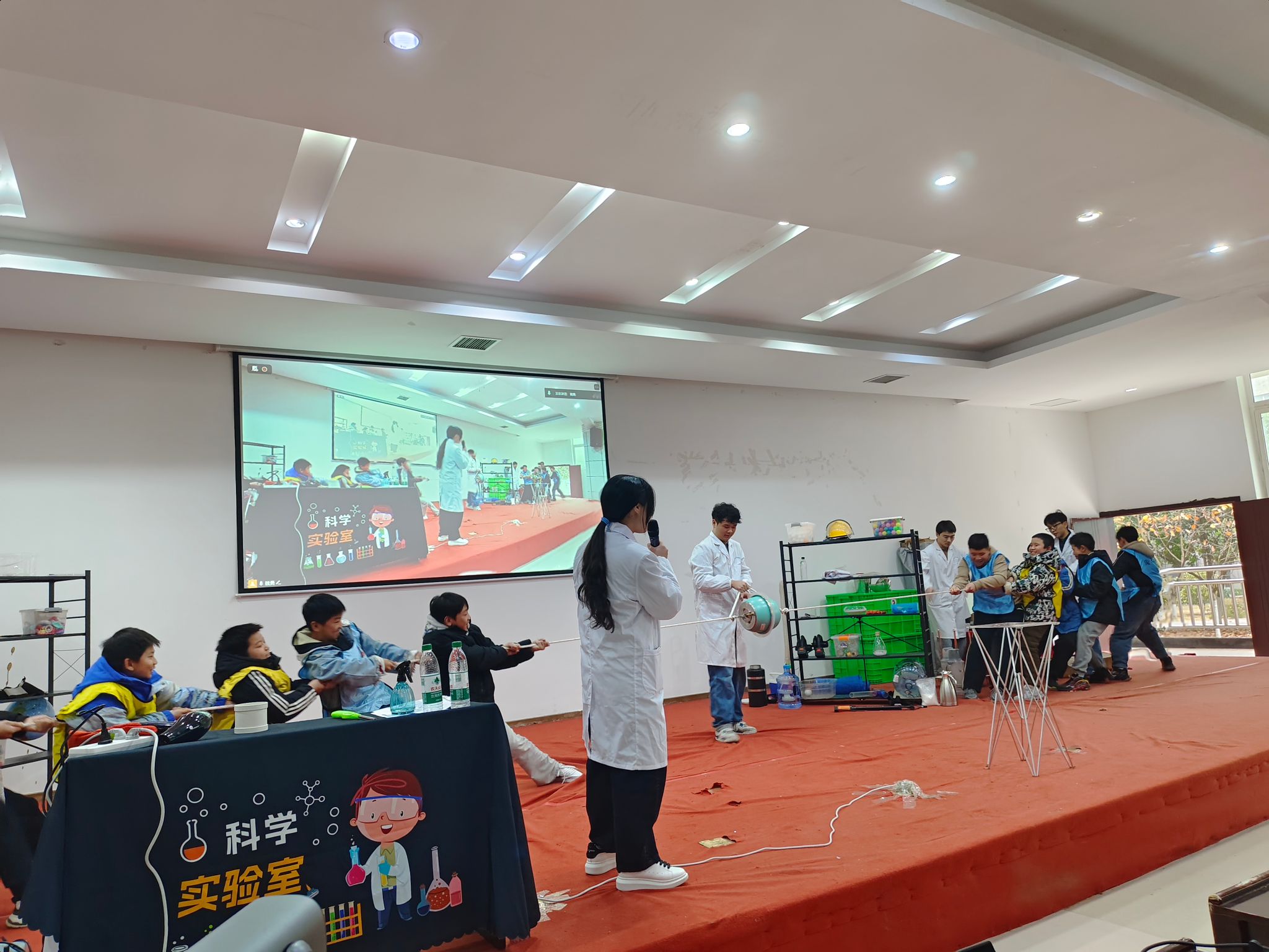 在魏勇老师的带领下,科普团队精心设计了以“体验科学、激发创新”为主题的科普实验展示环节。“空气大炮”“马德堡半球”“干冰泡泡”“液氮大爆炸”等经典科学实验依次呈现,将伯努利原理、大气压力、物态变化等知识转化为可观、可感、可参与的互动体验。现场气氛热烈,同学们在惊叹与掌声中切身感受到科学的魅力,激发了同学们对科学原理的浓厚兴趣。