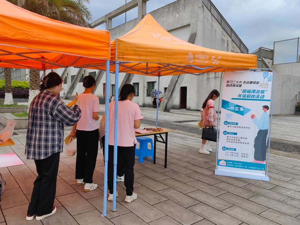 为更好凝聚青春力量,鼓励同学们通过书信的方式表达情感、释放压力,营造良好的学习氛围,我院于4月20日至4月21日在游泳池前广场处和山顶食堂门口广场处举办了“烦恼漂流瓶”书信解忧活动。