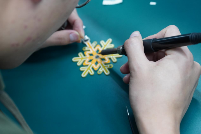 活动伊始,工作人员讲解了焊接基础知识,随后同学们在工作人员的指导下,亲手焊接属于自己的雪花灯,体验电子制作的独特魅力。焊接不仅考验动手能力,还需要耐心与细心,随着焊接工作的完成,一个个晶莹剔透的雪花灯被点亮。同学们相互展示作品,分享焊接经验,现场氛围热烈而富有学习乐趣。