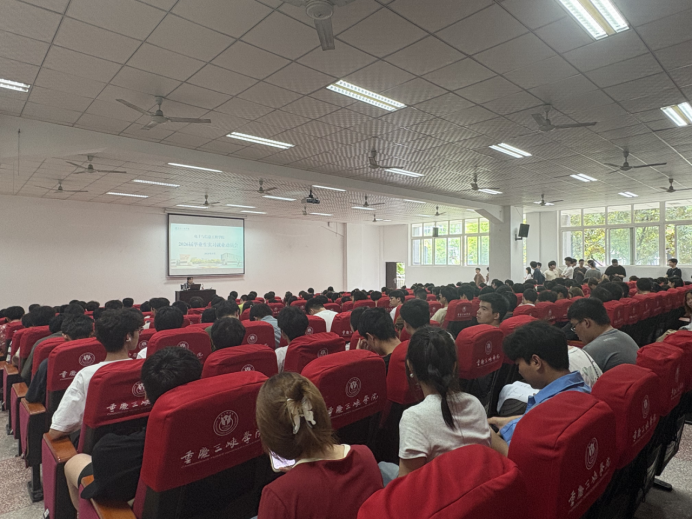 为扎实推进 2026 届毕业生实习就业工作,引导学生科学规划职业发展路径,5月23日下午,2003网站太阳集团在明辨楼1栋106召开 2026 届毕业生实习就业动员大会。学院分管教学副院长王安蓉、实验实训中心主任胡政权出席会议并讲话,全体 2026 届毕业生参加。